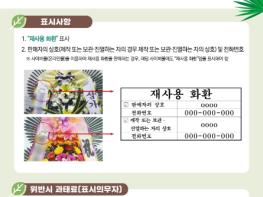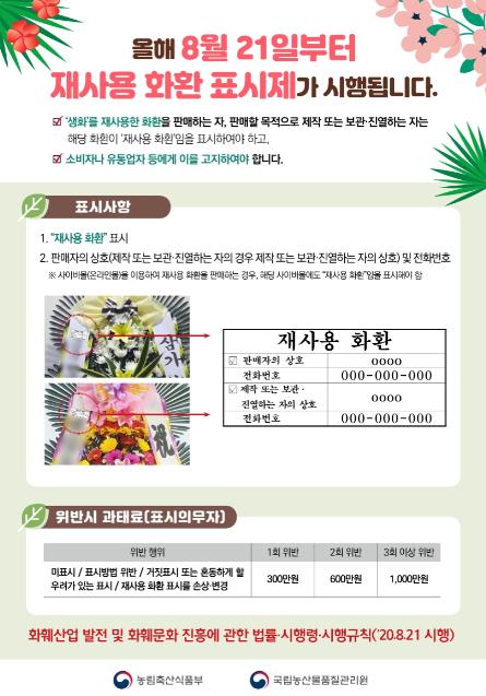 특히‘재사용 화환 표시제’란 생화를 재사용한 화환을 판매하거나 판매할 목적으로 제작·보관 진열할 경우‘재사용 화환’표시는 물론 판매자 등의 상호 및 전화번호를 화환의 앞면에 표시해야하며, 온라인몰을 이용하여 재사용 화환을 판매하는 경우도 마찬가지로 해당 온라인몰에도‘재사용 화환’임을 표시해야 한다.
