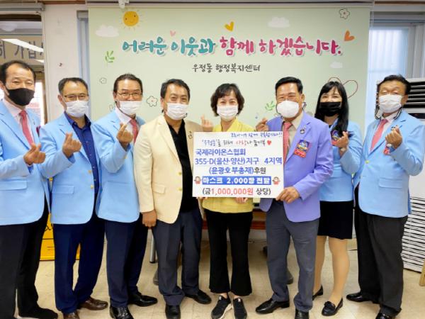 울산시 중구 국제라이온스협회 355-D(울산·양산)지구 4지역(부총재 윤광호)은 22일 오후 4시 울산 중구 우정동 행정복지센터를 방문해 마스크 2,000장을 전달했다.