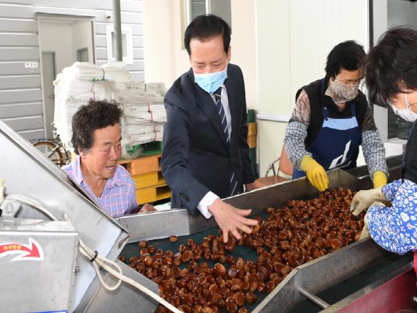 이날 현장을 방문한 구인모 군수는 올해 유난히도 길었던 장마로 인해 지난해보다 밤 굵기가 작고 수확량도 적어 근심하는 농민 한 분 한 분에게 위로와 격려를 아끼지 않았다.