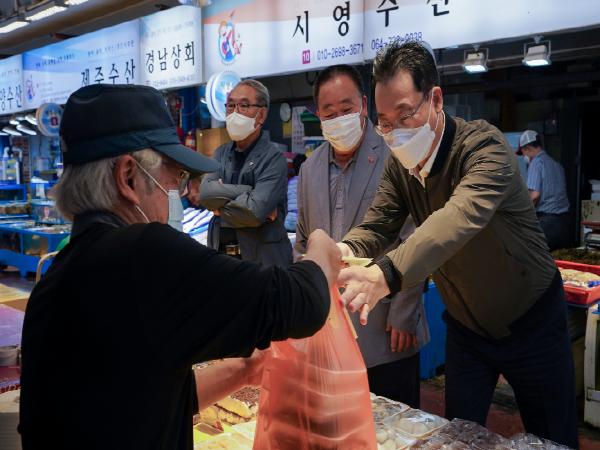 제주특별자치도는 23일 추석 명절을 일주일 앞두고 제주 동문시장을 방문해 추석 민심과 코로나 방역 상황을 살펴보고 전통시장 소비촉진을 위한 홍보 활동 등을 전개했다.