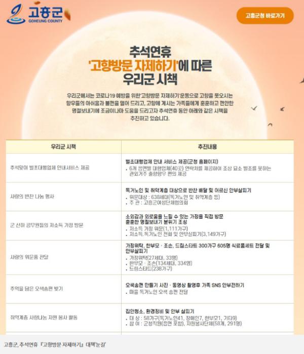 고흥군(군수 송귀근)에서는 코로나 19 확산 예방을 위한 고향방문 자제하기 운동으로 추석연휴에 고향을 못오시는 향우들과 고향에 계시는 가족, 친지들의 아쉬움과 불편을 조금이나마 덜어 드리고자 다양한 시책을 추진하고 있다고 밝혔다.