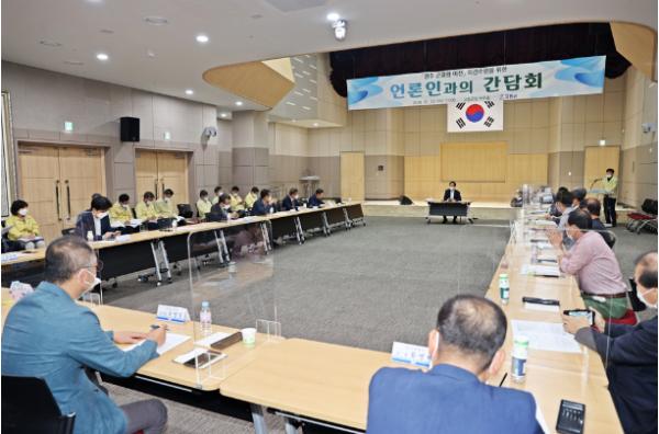 고흥군(군수 송귀근)은 23일 군청 우주홀에서 언론인 21명이 참석한 가운데 최근 이슈로 불거진 광주 군공항 고흥 이전 검토와 관련하여 언론인 의견을 수렴하는 소통의 시간을 가졌다.
