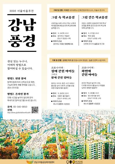 ‘기분 좋은 변화, 품격 있는 강남’을 실현 중인 강남구(구청장 정순균)가 ‘2020 서울마을주간’을 맞아 24일부터 28일까지 강남구 마을인문학 온라인 강연인 ‘강남풍경’을 4회에 걸쳐 진행한다.
