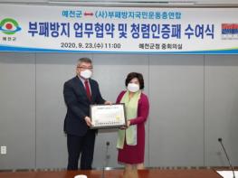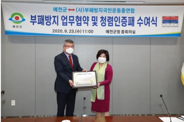 김학동 예천군수는 23일 오전 11시 군청 중회의실에서 국민권익위 산하 (사)부패방지국민운동총연합 전재용 전국여성중앙회장 등이 참석한 가운데 ‘부패방지 청렴인 인증패’를 수상했다.