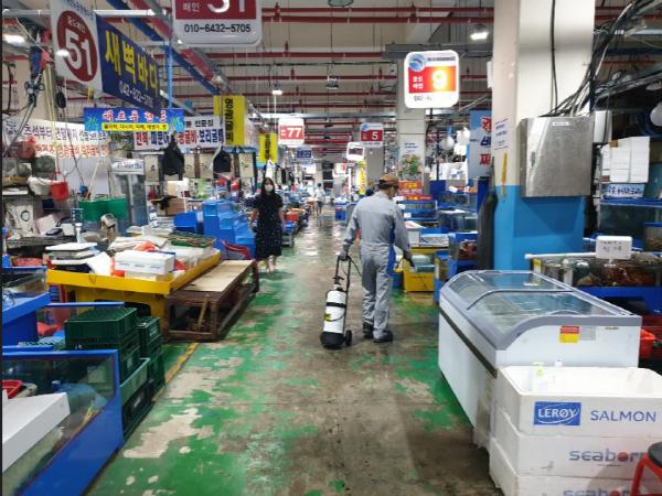 대전시는 추석 명절을 맞아 이용객이 크게 증가할 것으로 예상되는 농수산물도매시장에 대해 24일 코로나 19 확산 방지를 위한 일제방역을 실시했다.