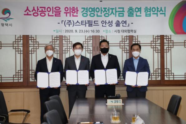 평택시(시장 정장선)는 지난 23일 관내 소상공인 지원을 위해 스타필드 안성과 경기신용보증재단, 평택시 소상공인상인연합회와 소상공인 경영안정자금 출연 협약을 체결했다고 밝혔다.