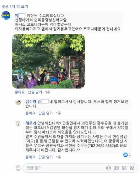주민 임 모씨가 구청장 페이스북에 남긴 댓글을 확인한 김수영 양천구청장은 즉시 해당 민원 사항을 확인 후 소관부서인 공원녹지과에 신속한 현장 확인을 지시하였으며, 담당 주무관은 현장에 즉시 출동하여 폐쇄된 공원에 의자를 가져와 장기를 두던 주민들에게 추후 재발방지를 위한 계도조치를 한 뒤, 수시로 현장 점검을 실시할 예정임을 민원인에게 SNS 댓글을 통해 상세히 안내했다.