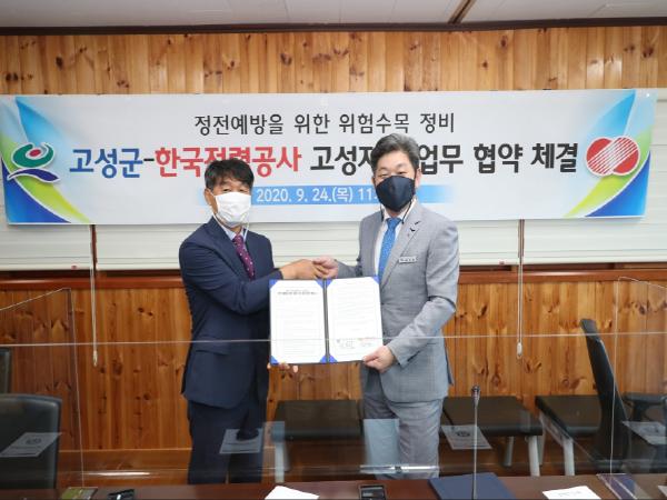 고성군(군수 백두현)과 한국전력공사 고성지사(지사장 김주하)는 9월 24일, 고성군청 소회의실에서 “정전예방을 위한 위험수목 정비 업무 협약식”을 체결했다.