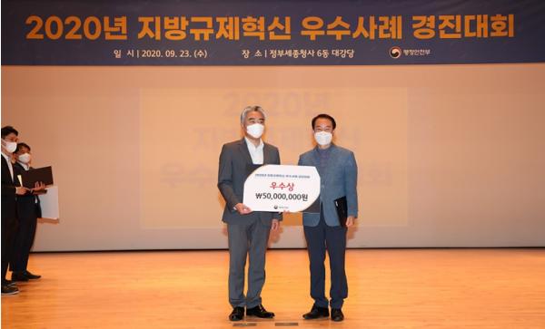 부산시는 어제(23일) 세종정부청사 대강당에서 개최된 행정안전부 주관 「2020년 지방규제혁신 우수사례 경진대회」에서 우수상과 장려상을 받았다고 밝혔다.