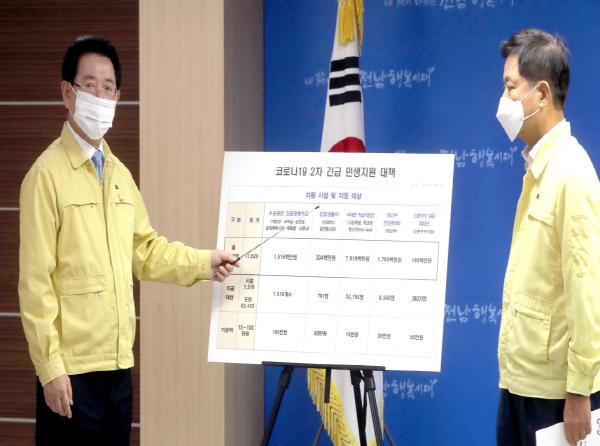 김영록 전남도지사는 24일 도청 브리핑룸에서 ‘코로나19 2차 긴급민생지원대책’을 발표하고 “정부 특별지원에서 빠진 4개 업종 1천 516개소에 소상공인 긴급 경영자금으로 100만 원씩을 지원하겠다”고 말했다.