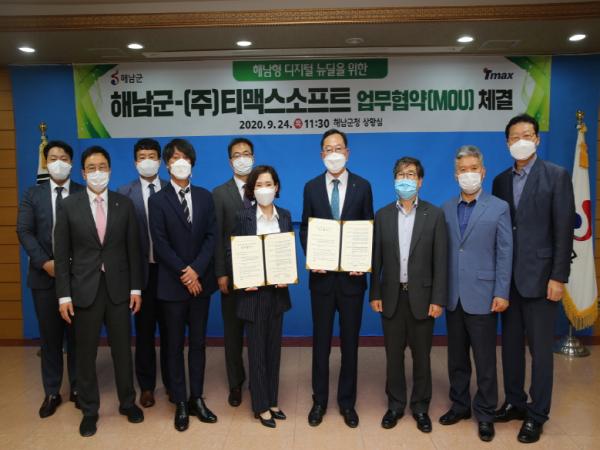 군은 24일 ㈜티맥스소프트와 해남형 디지털 뉴딜 사업추진을 위한 업무협약을 체결하고, 전문가 초청 간담회를 개최했다.