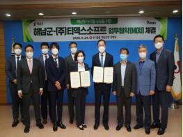 해남군청 상황실에서 진행된 업무협약식에는 명현관 해남군수와 티맥스소프트 박명애 사장이 참석해 디지털 뉴딜사업 지원과 기후변화대응 농업연구단지 조성을 위한 상생 교류를 약속했다.