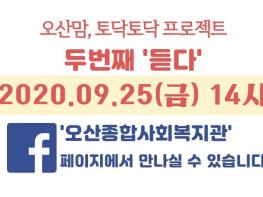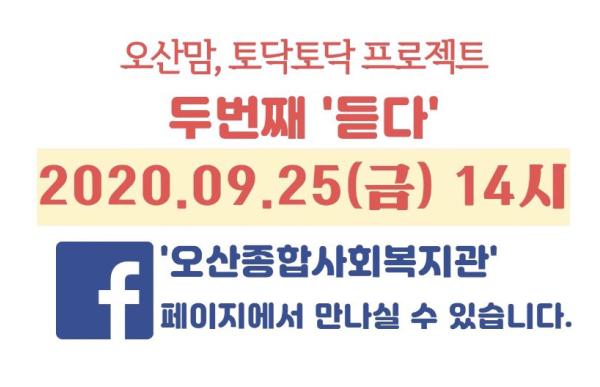 오산종합사회복지관 온라인 복지관 두 번째 프로젝트, 오산맘 토닥토닥‘묻다’는 마음을 나누고 싶은 오산 지역 엄마들이 참여 가능하며, 오는 9월 25일 오후 2시 페이스북 LIVE로 진행된다.