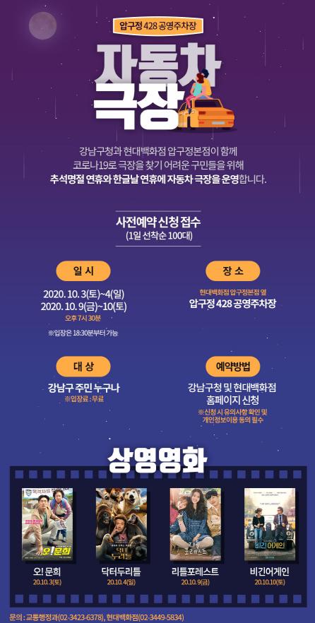 ‘기분 좋은 변화, 품격 있는 강남’을 실현 중인 강남구(구청장 정순균)가 추석·한글날 연휴기간 코로나19로 지친 구민의 심신을 위로하기 위해 다음달 3,4일과 9,10일 19시30분마다 현대백화점 압구정본점 옆 공영주차장(압구정로 161)에서 비대면 관람이 가능한 무료 자동차극장을 운영한다.