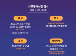 이번 무료 자동차극장은 강남구와 현대백화점 공동 개최하는 것으로 사회적 거리두기로 이번 추석 연휴 기간 고향에 방문하지 않거나 코로나19 장기화로 문화·예술을 접할 기회가 적어진 구민들의 일상 속 힐링을 돕는다.