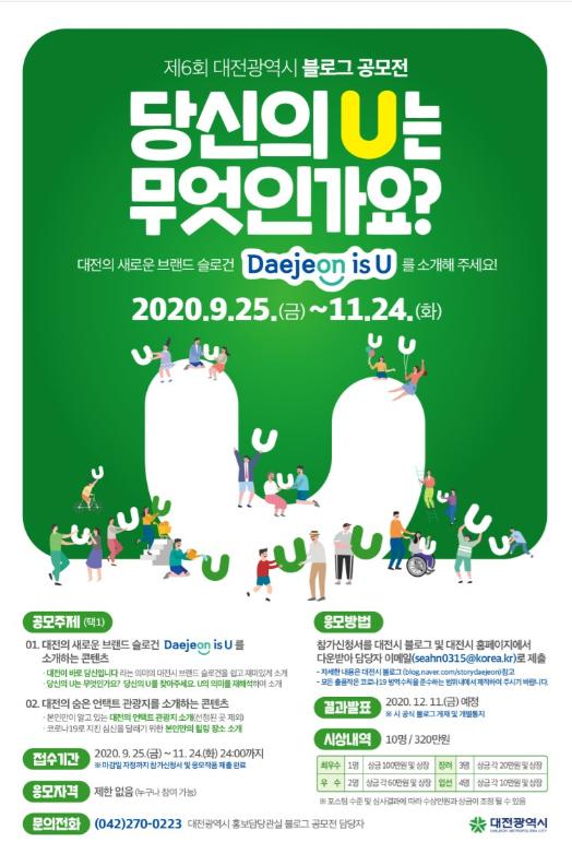 공모 주제는 대전시의 새로운 브랜드 슬로건인 ‘Daejeon is U’를 재미있게 소개하고, 본인이 생각하는 ‘U’의 의미를 찾아 소개하거나 대전의 숨은 매력이 담긴 언택트 관광지를 다룬 콘텐츠면 된다.