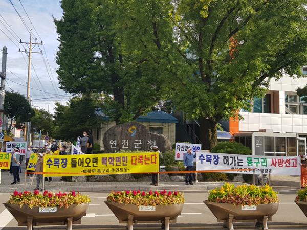 24일 오전, 통구리 주민 30여 명은 연천군청 앞에서 집회를 갖고 “통구리 주민 전부는 마을 주민들의 삶의 질을 저하시키고 마을 발전에도 전혀 도움이 되지 않는 종교단체 자연장지 조성을 결사 반대한다”고 주장했다.