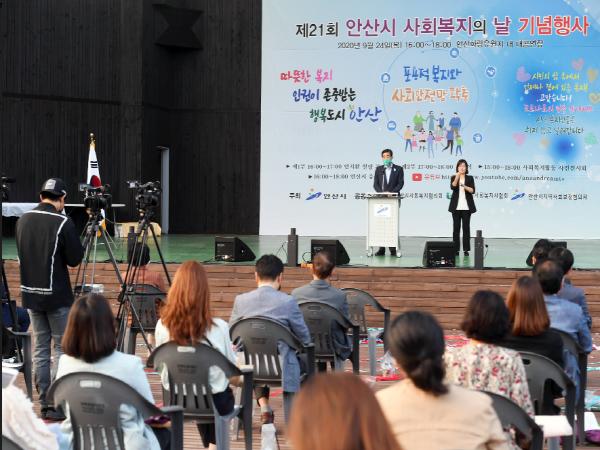 안산시사회복지협의회와 안산시사회복지사협회, 안산시지역사회보장협의체 주관으로 화랑유원지 대공연장에서 진행된 오프라인 행사에는 최소한의 인원이 참석했다. 온라인을 통해서도 500여 명이 지켜보며 사회복지의 날 기념식을 축하했다.