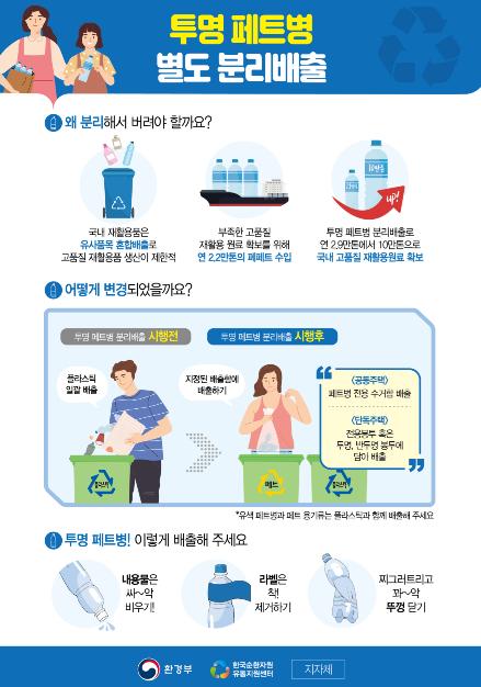 한편, 올해 12월25일부터 환경부의 ‘재활용가능자원의 분리수거 등에 관한 지침’이 개정됨에 따라 전국 공동주택은 투명 페트병 분리배출이 의무화된다.