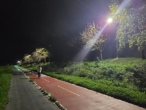 진천군이 백곡천변 자전거도로 가로등 설치공사를 마무리 지으며 지역 주민들의 야간 운동 및 보행길을 환하게 비춰주고 있다.