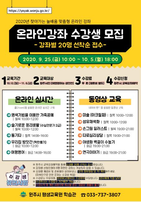 9월 25일(금) 10시부터 원주시 교육강좌예약 홈페이지를 통해 선착순으로 접수한다.