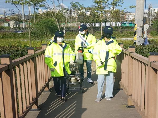 의왕시 부곡동 행복마을관리소는 지난 24일 왕송호수 일대에 코로나19 방역 활동을 실시하였다.