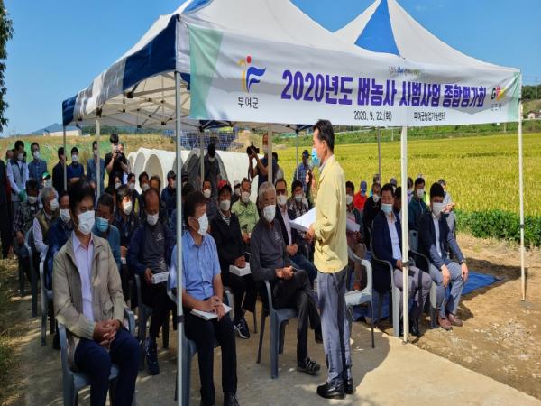부여군농업기술센터는 지난 22일 신기술보급사업 현지포장에서 벼농사연구회, 쌀전업농, 시범사업농가 등 30여명이 참석한 가운데 식량작물 기술보급사업 종합평가회를 가졌다.