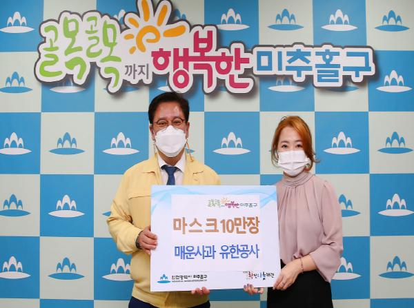 국제전자상거래 기업인 매운사과 유한공사가 미추홀구에 일회용 마스크 10만장을 기탁했다.