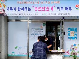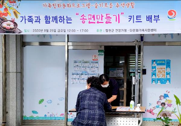 합천군 건강가정다문화가족지원센터에서는 지난 25일 가족친화문화프로그램의 일환으로 가족이 다함께 슬기로운 추석을 보내자는 의미로 가정 내에서 할 수 있는 송편만들기 체험키트를 관내 70가정에 드라이브 스루 방식으로 배부했다.