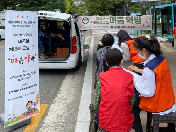 대구 수성구 건강가정?다문화가족지원센터는 24일부터 25일 양일간 용지아파트(범물종합사회복지관 앞)에서 심리안정을 돕기 위해 찾아가는 이동 상담 “마음약방”을 운영한다고 밝혔다.