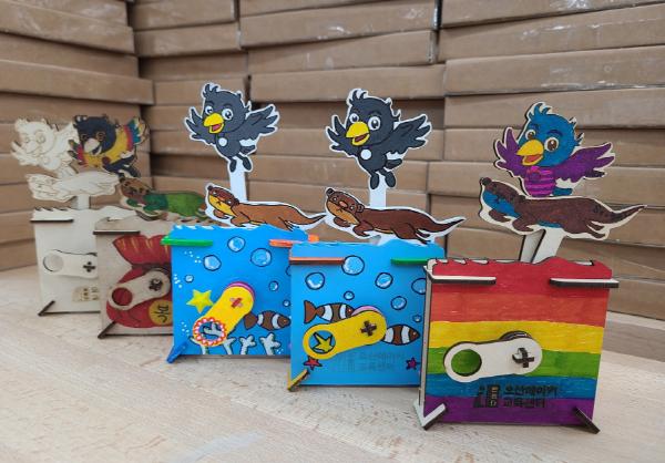 이번에 배포하는 키트는 ‘방콕메이킹 교실 1교시 까산이와 수달이’로 오토마타를 활용한 메이킹 키트이며, 오산시의 캐릭터인 까산이와 오산천 수달이가 움직이는 모형이다.