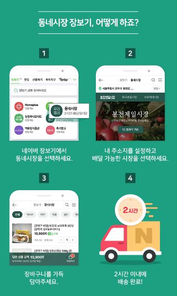 이 사업은 스타트업‘우리동네커머스’와 제휴로 네이버의 동네시장 장보기 플랫폼에 입점을 지원하는 사업으로 소비자가 피시(PC) 또는 모바일에서‘○○시장 장보기’를 검색해 해당시장을 클릭한 뒤 주문하면 된다.
