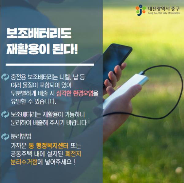 대전 중구는 오는 12월까지 충전용 보조배터리 분리배출과 회수?재활용 체계 구축을 위한 시범사업을 추진하다고 밝혔다.
