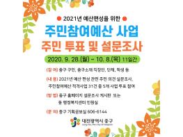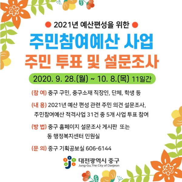 대전 중구는 2021년도 예산편성을 위한 주민참여예산 사업(총 7억원 규모) 주민 투표와 설문조사를 9월 28일부터 10월 8일까지 11일간 진행한다.