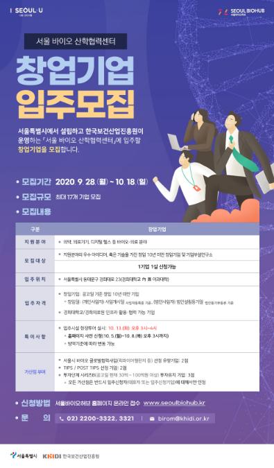 서울시는 오는 11월 개관할 ‘서울 바이오 산학협력센터(동대문구 경희대로 23)’의 입주기업 17개사를 10월 18일(일)까지 모집한다고 밝혔다. 경희대학교 舊 이과대학 안에 조성되며, 입주기업에는 최대 4년간 사무공간 임대료 무상지원, 기업별 성장패키지 지원, 홍릉 강소연구개발특구 지정에 따른 세게 감면 혜택 등이 제공된다.