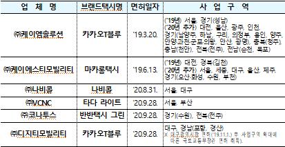 이에 따라 운송가맹사업의 서비스지역이 지속 확대되고, 운영중인 브랜드택시는 ’20.8월말 기준 18,615대로써 ’19년말 대비 7.8배 증가하였다.