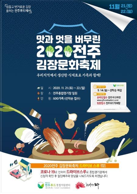전주푸드통합지원센터는 오는 11월 21일부터 이틀간 전주종합경기장에서 600가족을 대상으로 드라이브 스루 방식으로 ‘2020 전주김장문화축제’를 개최한다. 당초 전주김장문화축제는 3일간 가족과 친척, 이웃들이 다 같이 모여 김치를 담그고, 이웃과 나누는 행사로 기획됐으나 코로나19 여파로 이같이 변경됐다.