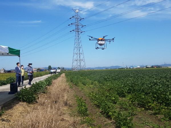 농업기술센터는 28일 오산면에서 전북농업기술원, 농업인 등이 참석한 가운데 드론활용 논콩 병해충 방제 평가회를 가졌다.
