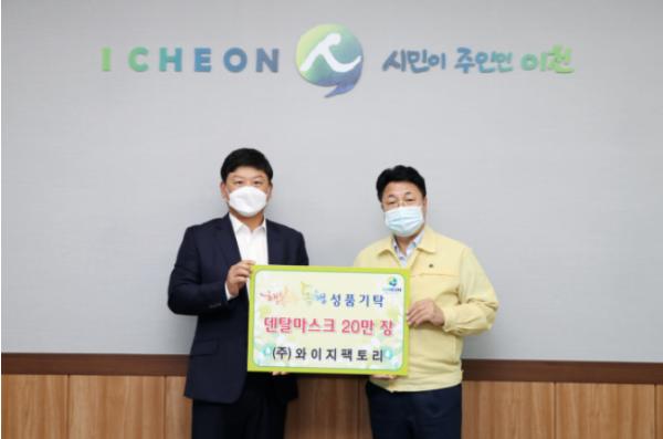 이천시는 ㈜와이지팩토리에서 덴탈마스크 20만 장을 전달하였다고 밝혔다.