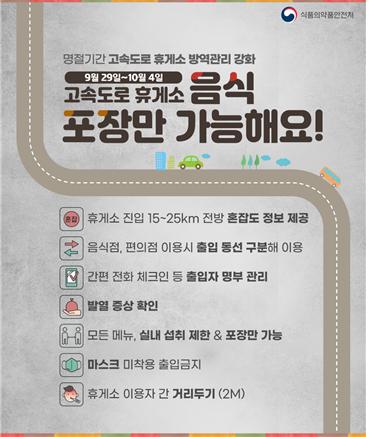 식품의약품안전처는 이의경 처장이 9월 28일 코로나19 감염 차단을 위해 방역관리에 힘쓰고 있는 고속도로 죽암휴게소(부산방향 하행선)를 직접 방문하여 방역관리 현장을 살펴보고 애로사항을 청취한다고 밝혔다.