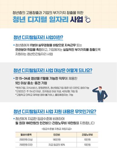 청년 디지털 일자리.청년 일경험 지원 사업은 청년을 채용한 기업에 인건비를 지원하는 사업으로, 현재 민간운영기관을 통해 기업을 대상으로 참여 신청을 받고 있으나 취업을 희망하는 청년도 사업 운영기관 또는 취업 포털 사이트를 이용해 기업이 채용하는 일자리를 확인하고 참여할 수 있다.