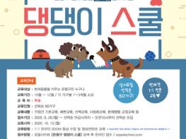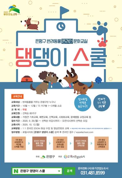 은평구 반려동물 문화 교실 ‘은평구 댕댕이 스쿨’은 9월 28일(월)부터 온라인(포털사이트 ‘은평구 댕댕이 스쿨’ 검색으로 선착순 80가구를 접수해서, 10월 12일(월)부터 1:1 온라인 맞춤교육을 시작한다.