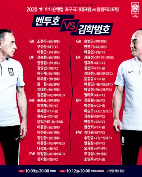 파울루 벤투 감독이 이끄는 남자 국가대표팀과 김학범 감독이 이끄는 남자 U-23 대표팀은 오는 10월 9일과 12일에 고양종합운동장에서 두 차례 친선 맞대결을 가진다. 이번 경기의 공식 명칭은 ‘2020 하나은행컵 축구국가대표팀 vs 올림픽대표팀 친선경기’다.