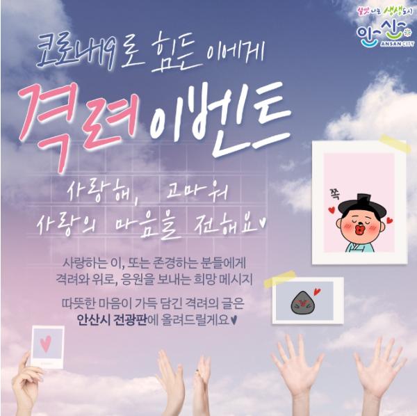 안산시는 시 공식 SNS를 활용해 진행한 ‘코로나19 극복 희망 메시지 보내기 이벤트’에 참가한 메시지를 오는 30일부터 시 곳곳에 설치된 전광판과 사이니지를 통해 시민 모두와 공유한다고 29일 밝혔다.