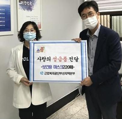 근로복지공단 부산지역본부에서는 직원들의 자발적인 기부 참여를 통해 모은 보건용 마스크 220매를 초량3동 취약계층을 위해 전달하며, 코로나19로 어려운 시기에 따뜻한 이웃사랑의 나눔을 실천했다.