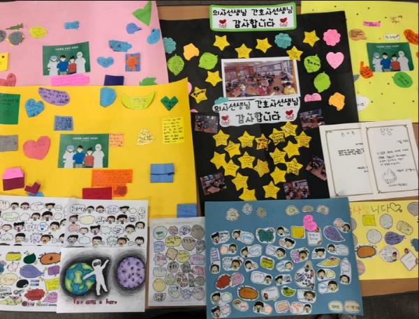전달된 그림과 감사장 등에는 엄지손가락을 들고 코로나19 극복을 위해 노력하고 있는 의료진 등에게 감사와 응원을 보내는 학생들의 사진과‘덕분에 안전해요’, ‘당신은 영웅이에요’등 힘나는 응원 메시지가 담겨 있었다.