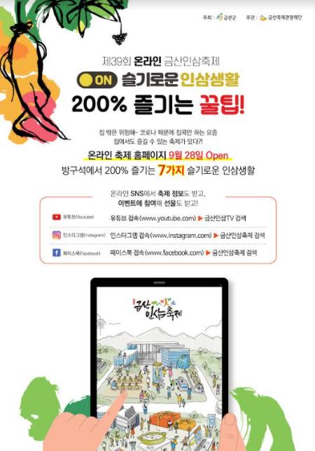 금산축제관광재단(이사장 문정우)은 오는 10월 9일부터 시작하는 제39회 온라인 금산인삼축제 프로그램 홍보에 나선다.