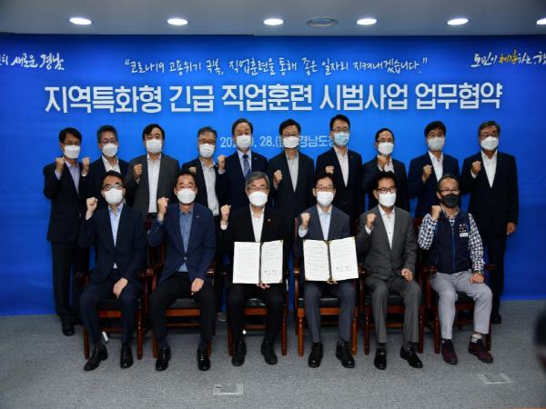 지난 28일 오후 경남도청 회의실에서 열린 고용노동부와 경상남도 간의 직업훈련 시범사업 협약식에는 거제시장을 비롯한 사업 참여 지자체장과 기업체, 노동계, 훈련센터, 한국노동연구원 등 관계기관에서 20여명이 참석했다.