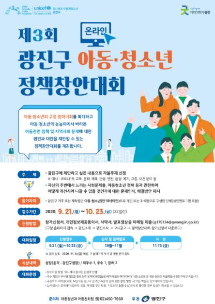 광진구가 지역 내 아동·청소년의 구정 참여기회를 확대하고 구 정책에 대한 목소리를 듣고자 ‘제3회 광진구 아동·청소년 정책창안대회’를 개최한다.