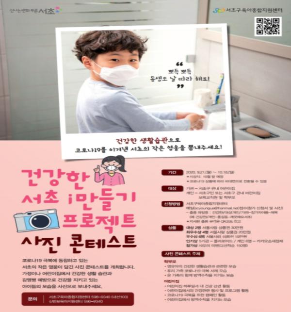 코로나19 극복을 위해 재밌고 톡톡튀는 생활 습관으로 건강을 지키고 있는 아이들의 사진 또는 영상을 10월18일까지 서초구육아종합지원센터 (scyoungua@hanmail.net / ☎02-598-9340)로 접수하면 된다.